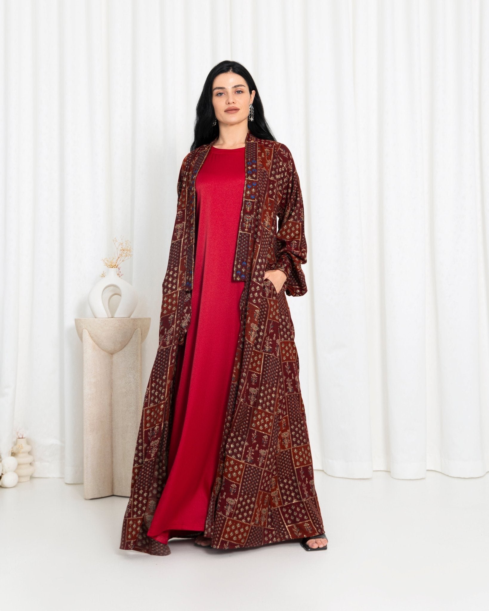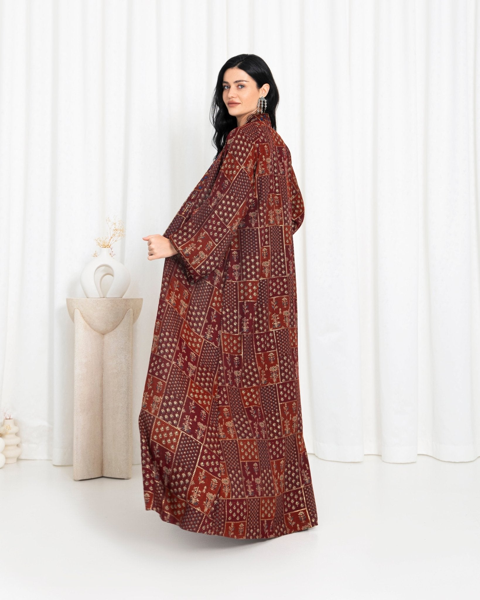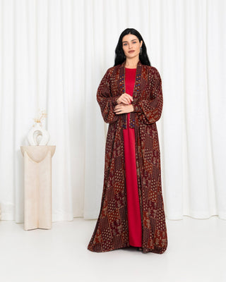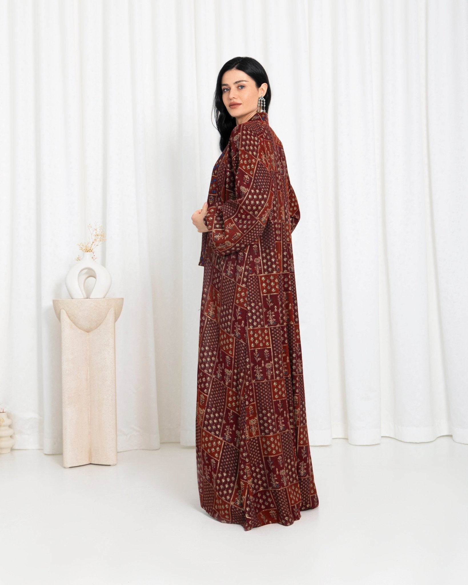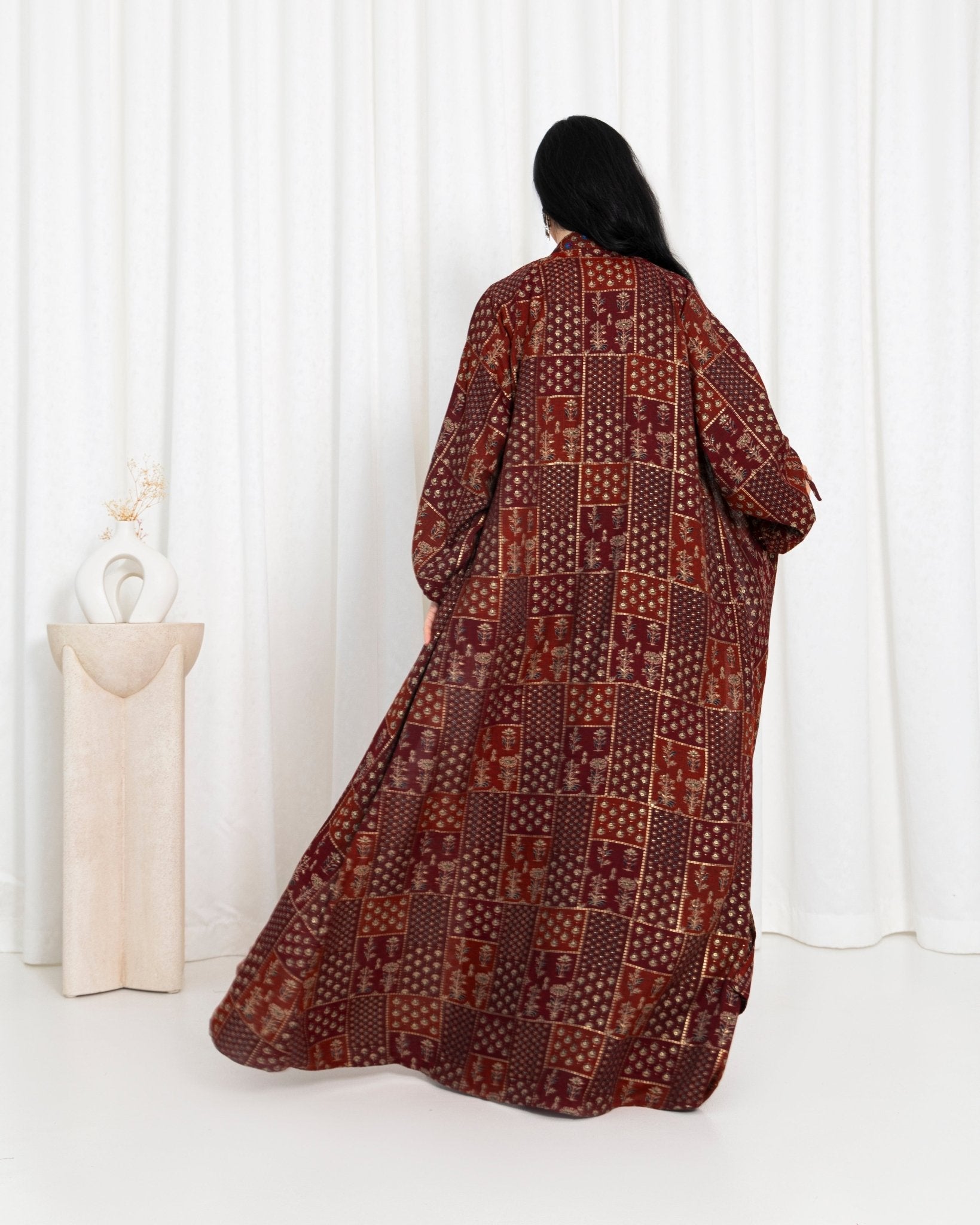 Indulge in the captivating allure of our Maroon Floral Check Kimono Abaya from the Tibea Collection.