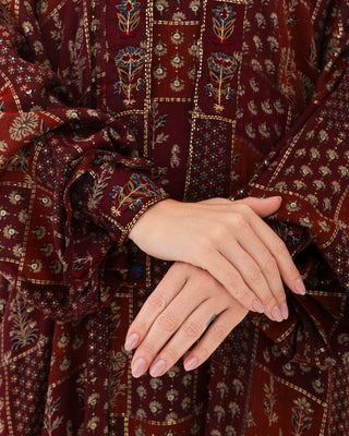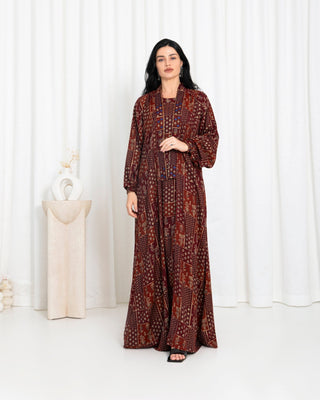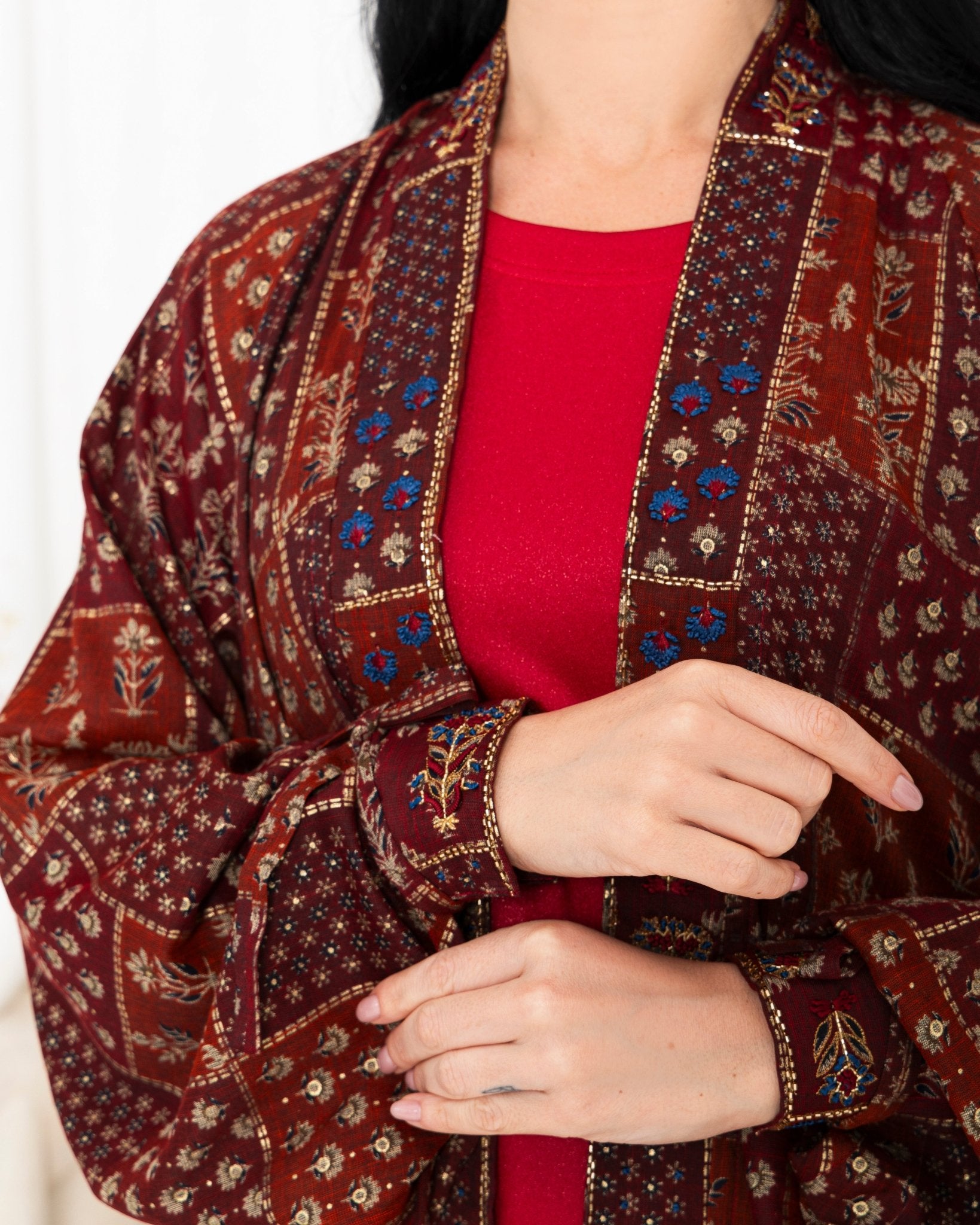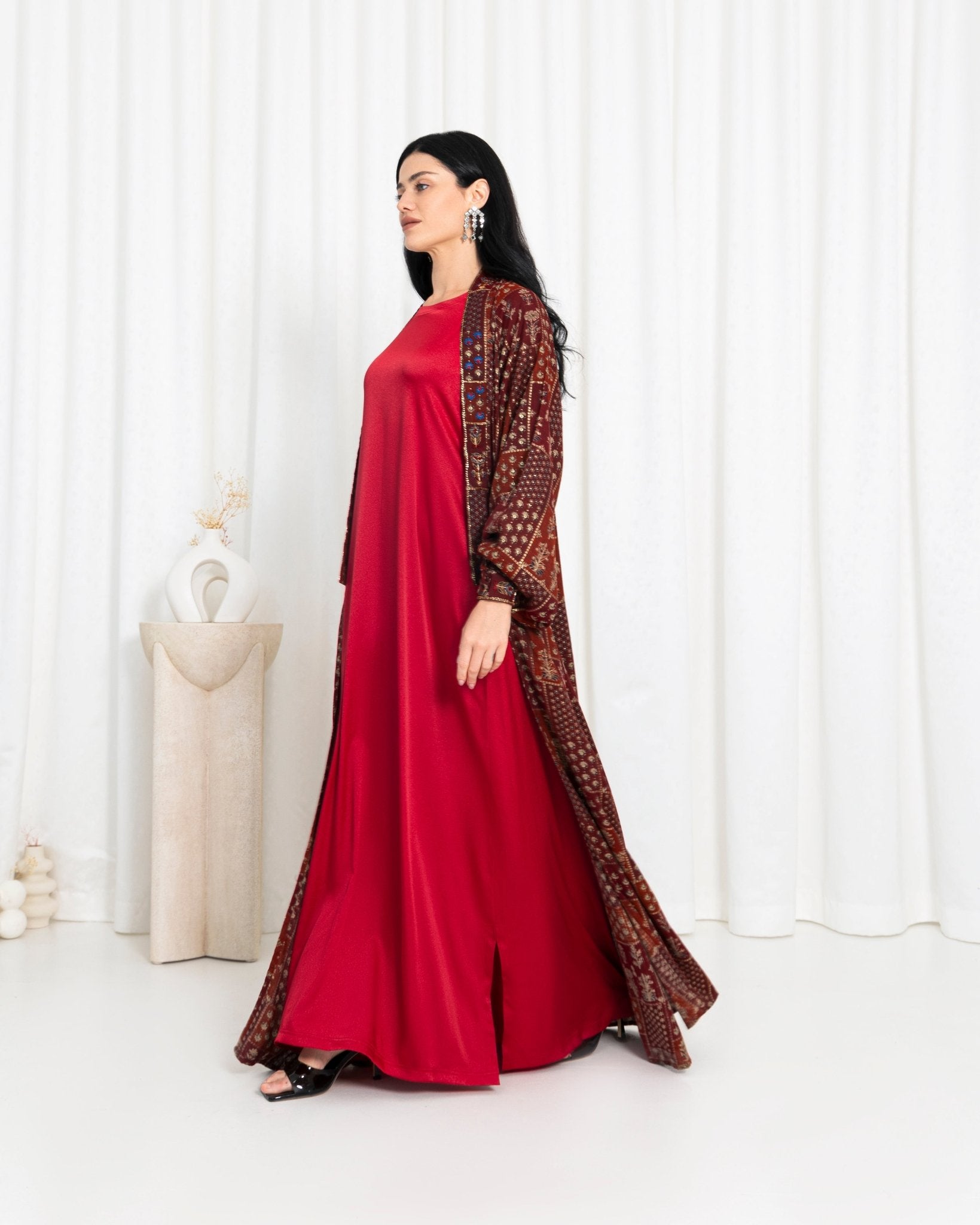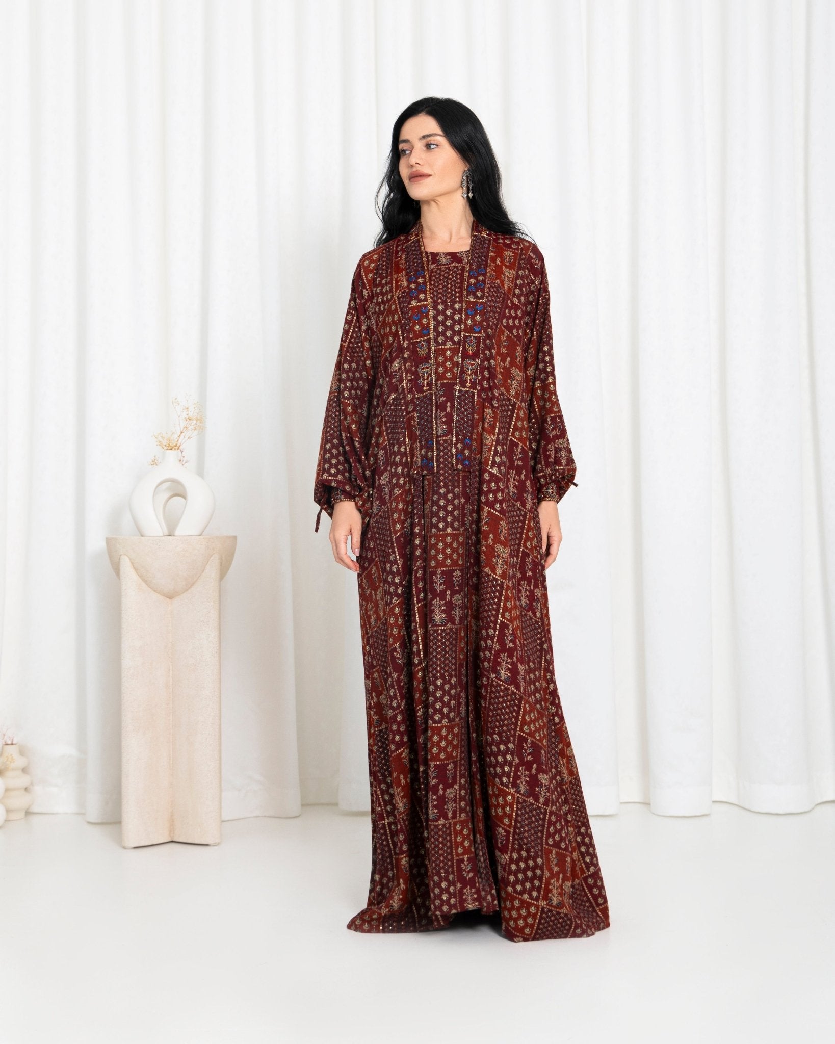 Indulge in the captivating allure of our Maroon Floral Check Kimono Abaya from the Tibea Collection.
