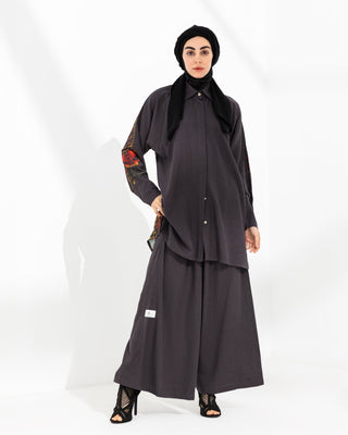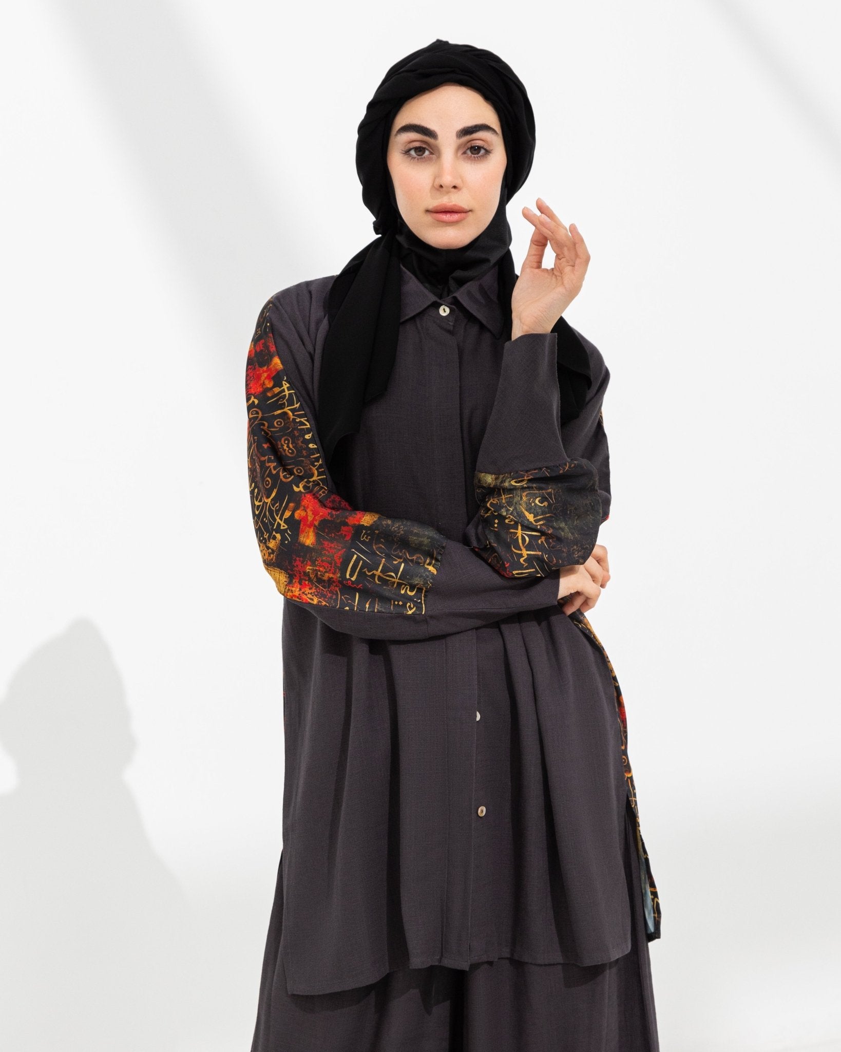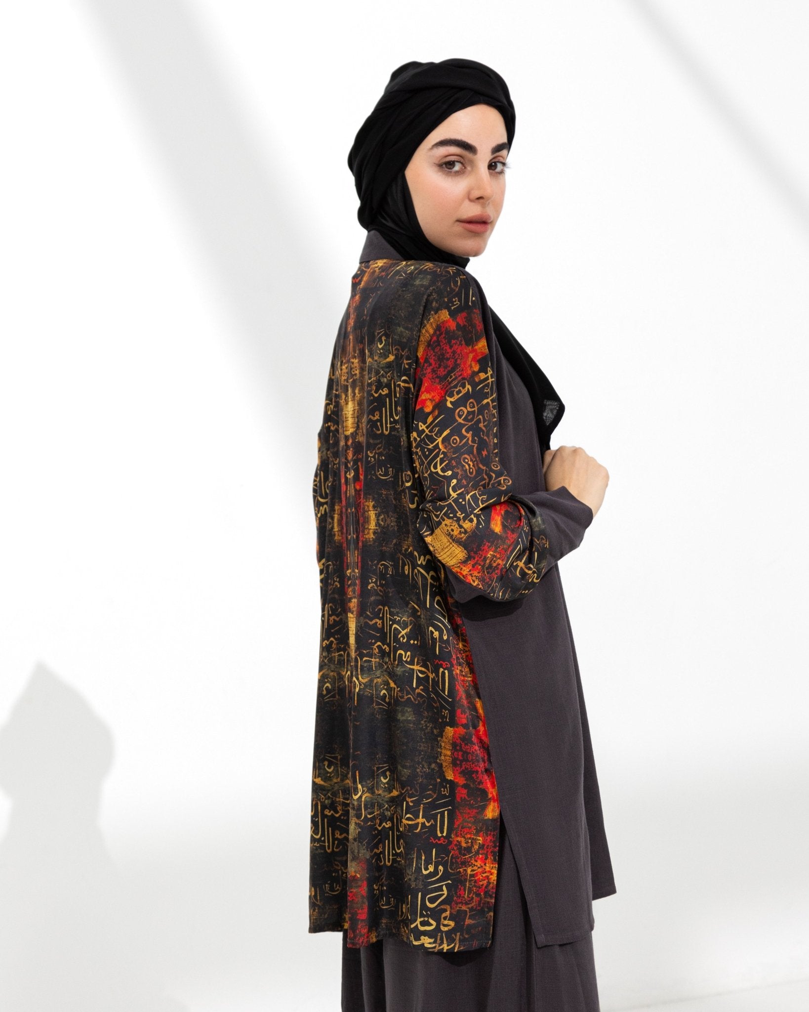 Jazr is where retreat becomes return. With a charcoal linen front and a back adorned in fiery calligraphy silk art, this piece is made for transitions. Shehna’s print glows with reds and golds—like embers waiting to rise. Perfectly balanced with a loose shirt and wide linen trousers.