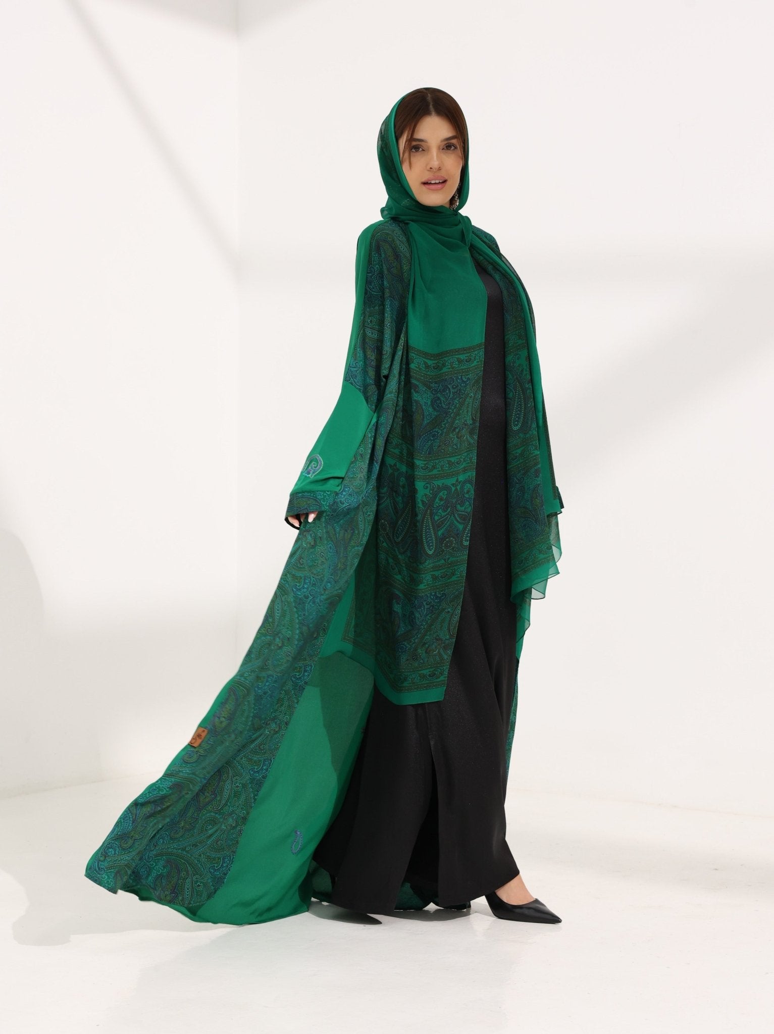 A fluid kimono-style abaya that moves like a soft breeze—crafted in a deep jade green with an intricate Kashmiri-inspired paisley story. The silhouette is intentionally relaxed with wide kimono sleeves and an open-front drape that layers effortlessly over your inner dress. Finished with delicate scattered motif embroidery and paired with a matching chiffon Sheila, this piece is made for evenings, gatherings, and quiet elegance—where modesty feels elevated, not heavy.