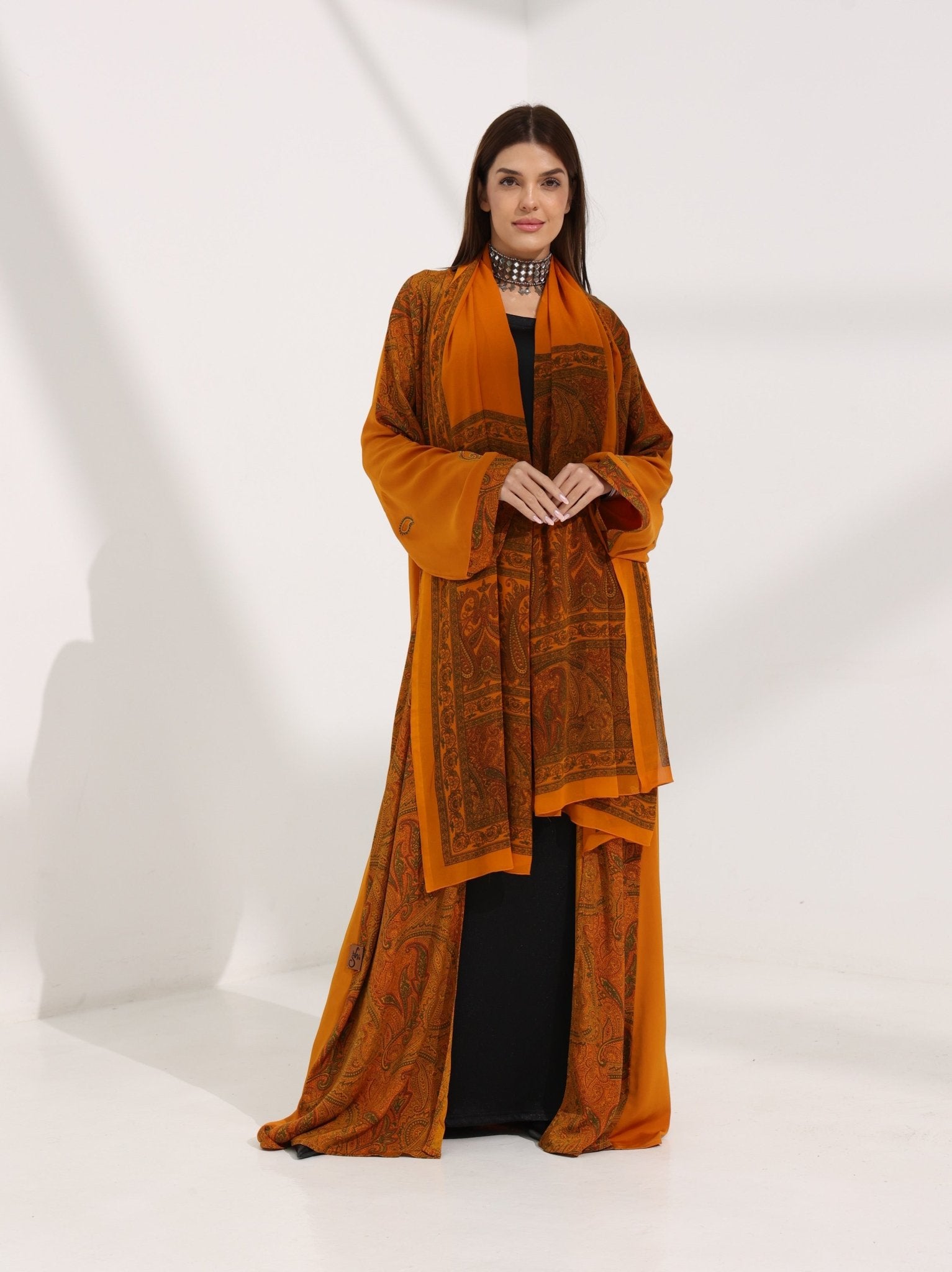 Cut in a fluid kimono silhouette, this abaya falls in an easy, graceful line, designed for comfort without losing presence. The beauty is in the contrast: a rich saffron crepe base meets heritage patchwork-style prints in sand, amber, and earthy brown — creating a refined “bloom tapestry” effect from shoulder to hem.