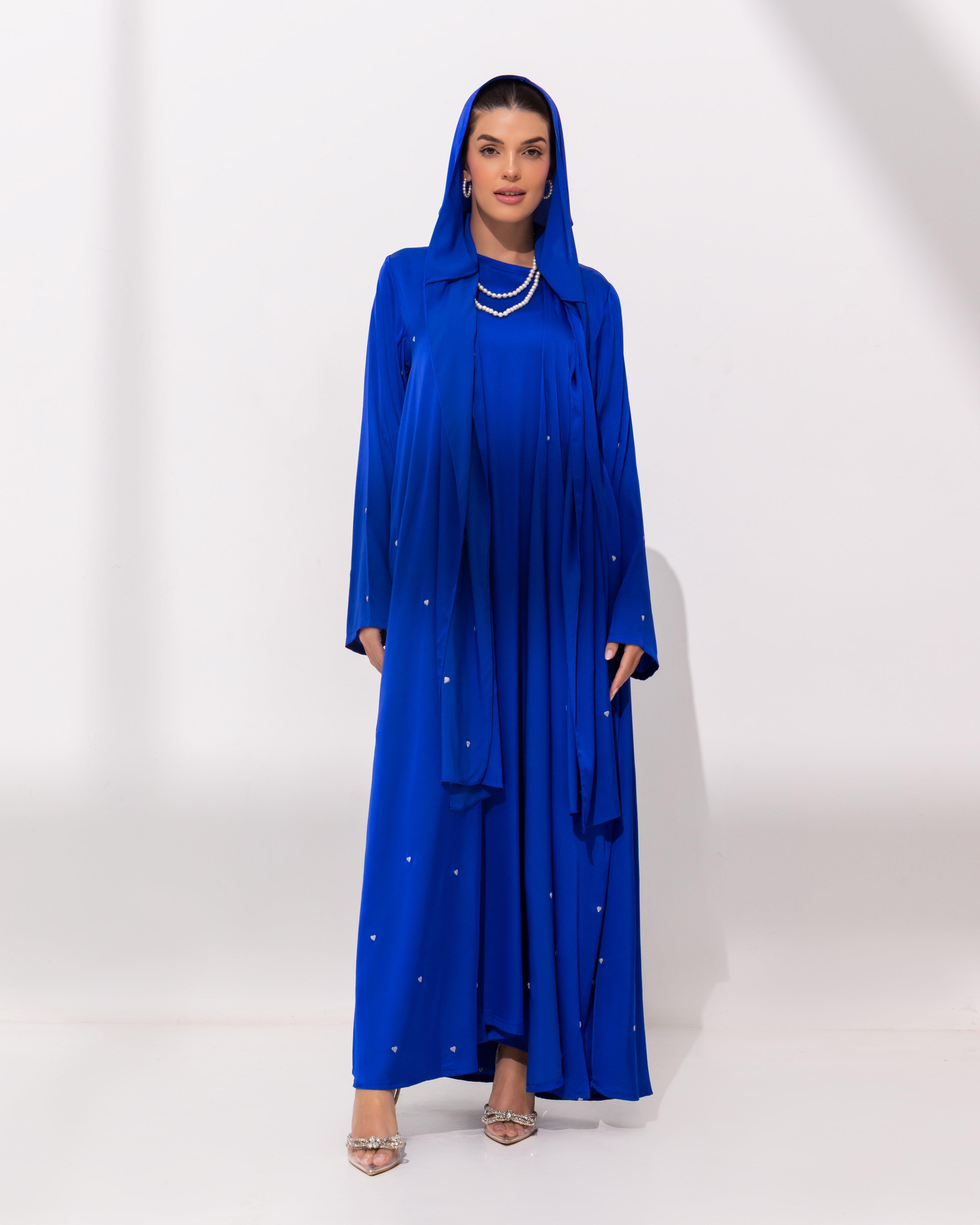 In Sapphire Blue, the rich hue of a twilight sky meets a bold design. This abaya stands out with its deep blue Aramani fabric that radiates confidence and sophistication. A striking choice for when you want to feel both regal and empowered, it captures attention with refined vibrance.