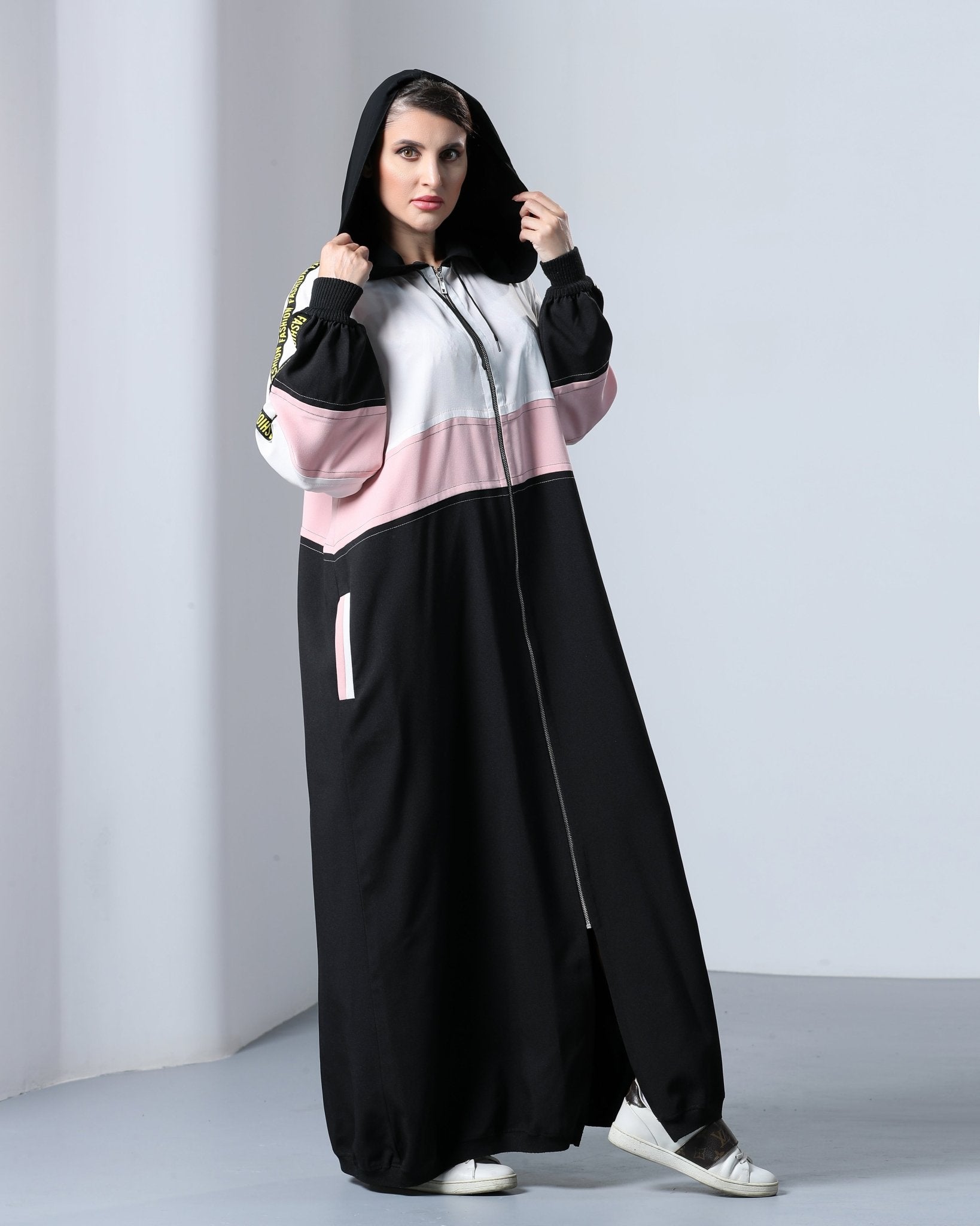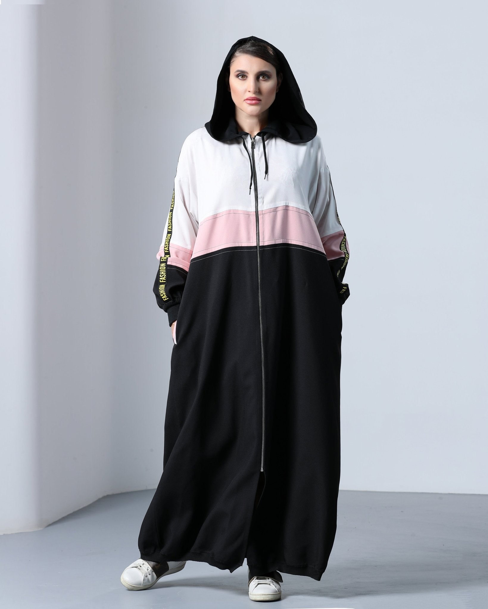 Crafted with high-quality fabric, this abaya feels comfortable and breathable, making it suitable for daily wear or casual outings. The relaxed fit and practical design elements, like a front zipper or pockets, make it both functional and stylish. It pairs beautifully with sneakers, giving it an athletic edge that makes it stand out.
