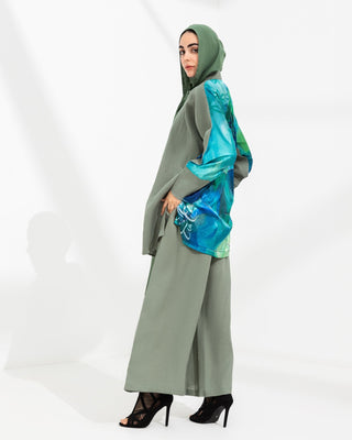 Rauh evokes calm, crafted in sage linen at the front and adorned with sacred geometry in Shehna’s silk artwork at the back. The silhouette flows with kimono sleeves, button-down closures, and wide-leg linen pants that feel like stillness in motion. A wearable breath of peace.
